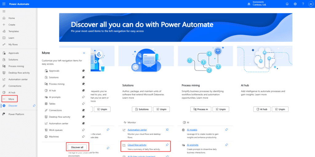 2. Ở menu bên trái, chọn More (Thêm)Cloud flow activity (Hoạt động của Cloud flow).